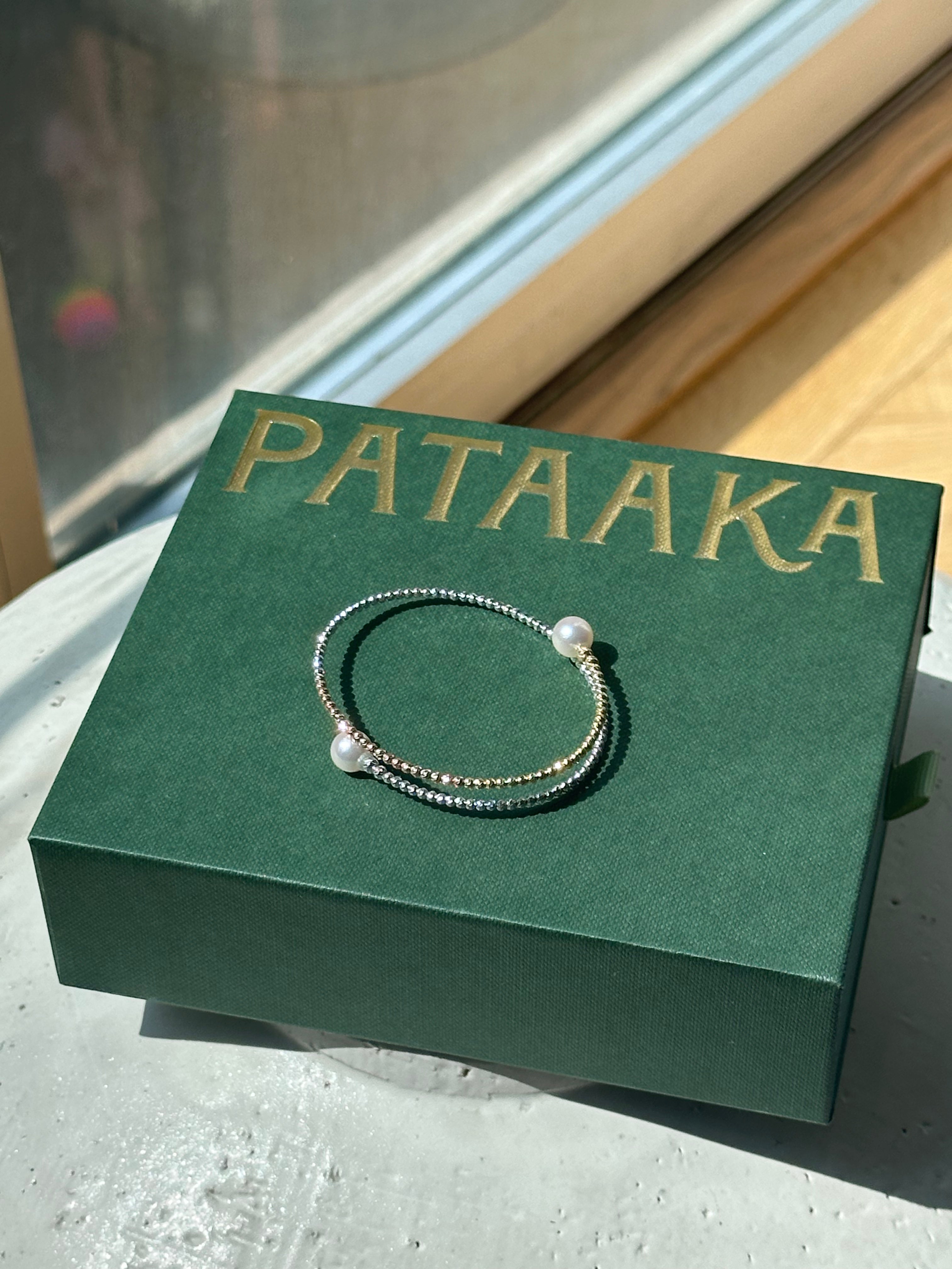 This exquisite bracelet features a delicate blend of gold and silver tones, adorned with lustrous pearls at each end. Its minimalist design exudes sophistication, making it a perfect accessory for both casual and formal occasions.