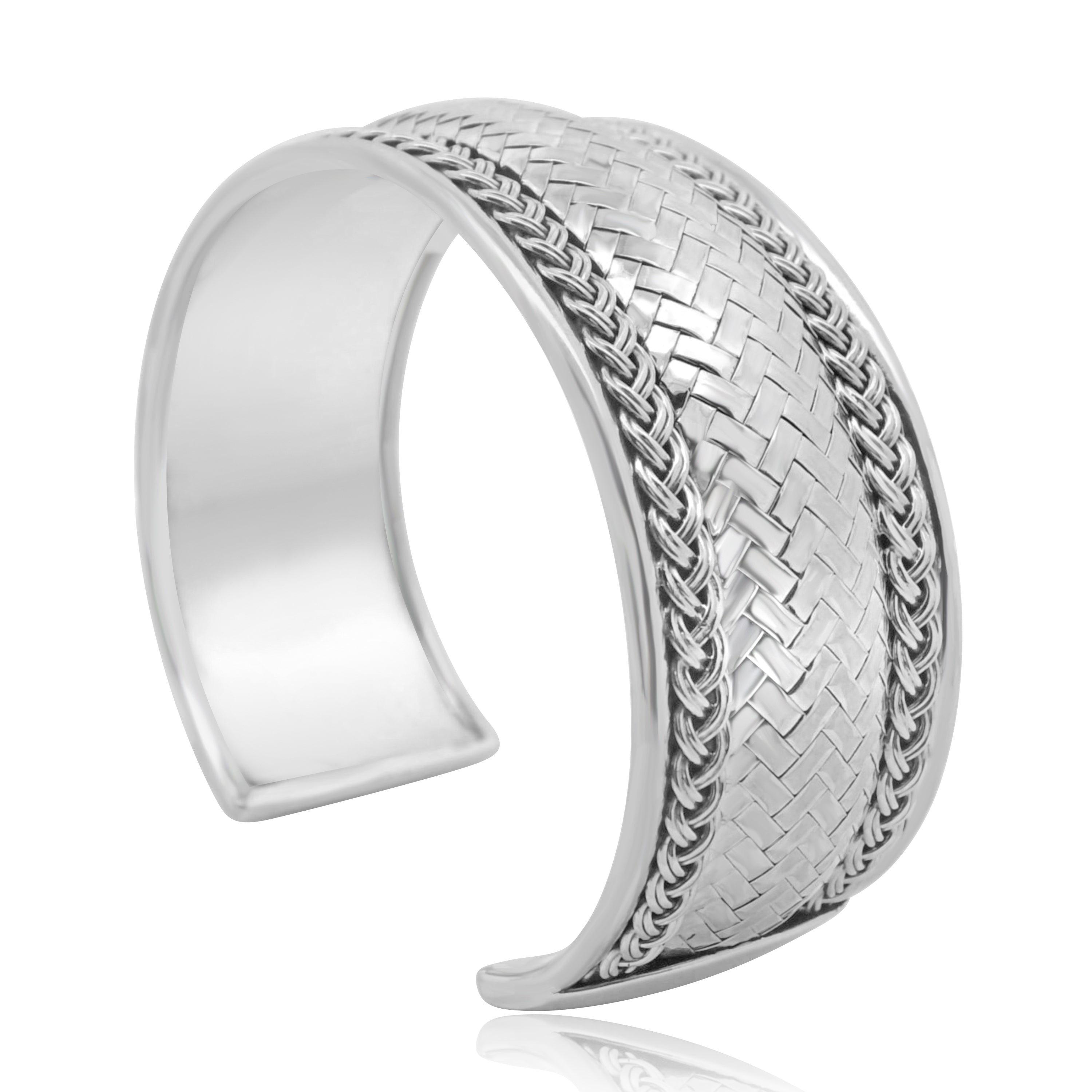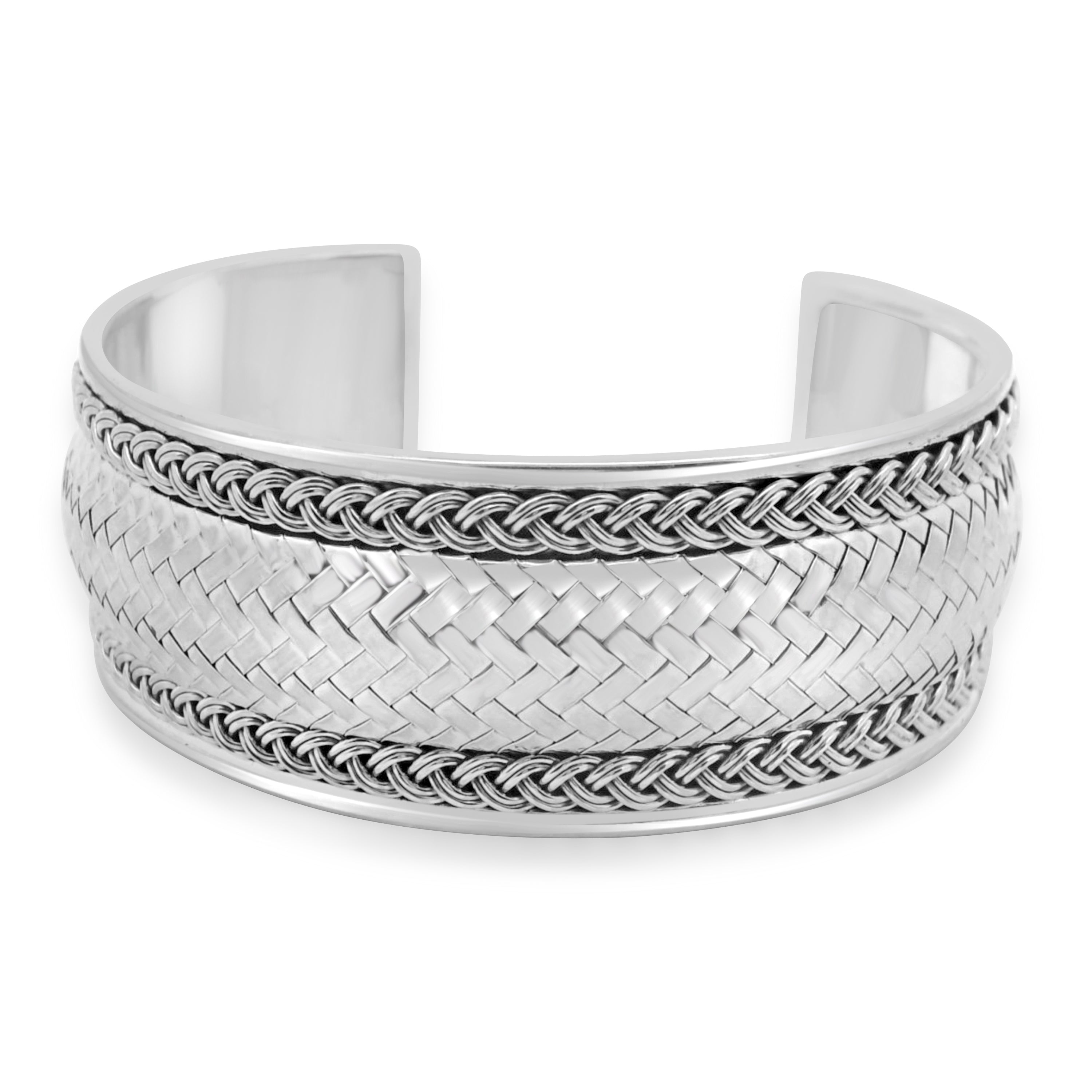 A bold echo of timeless craftsmanship, the Heritage Weave Silver Cuff is a tribute to artisanal mastery. Handcrafted in pure 925 sterling silver, this open cuff features an intricate woven pattern at its heart — symbolising unity, strength, and tradition — bordered by twisted rope detailing that adds depth and dimension. Sculptural yet wearable, it’s designed to make a statement, whether worn solo or stacked.