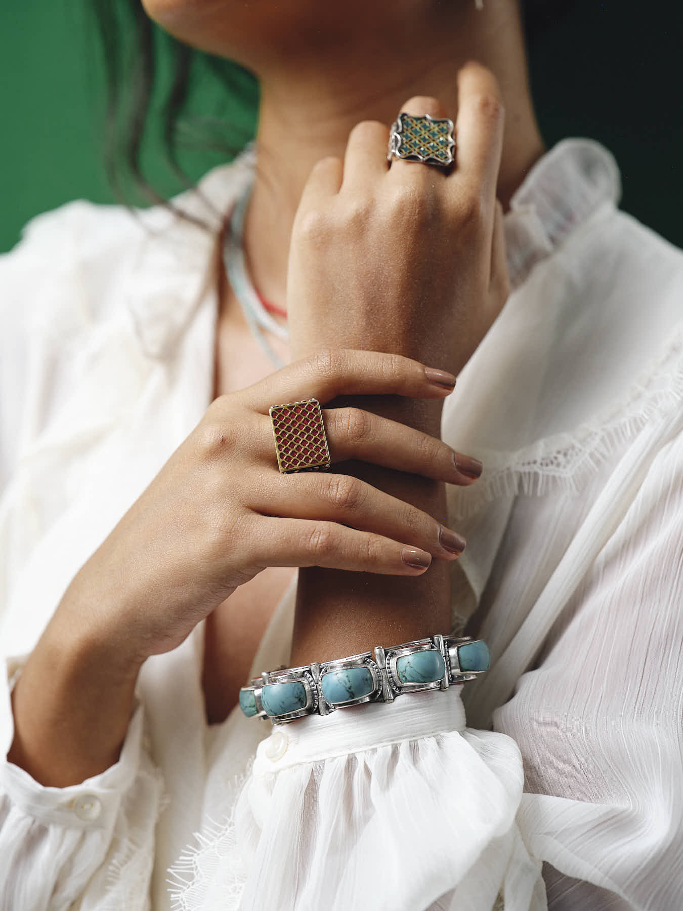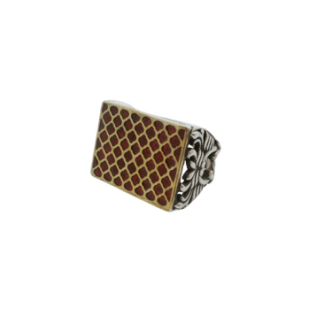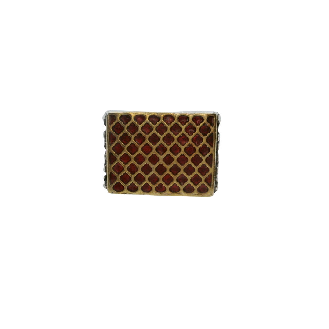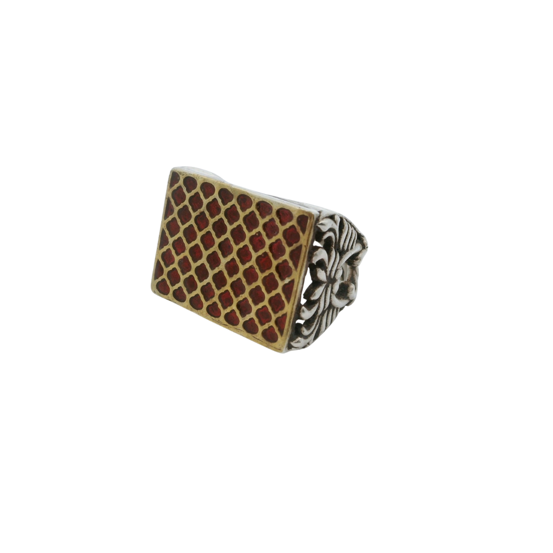 The Gold Mughal Jaali on Red Enamel ring features a captivating red patterned design, set in a luxurious sterling silver metal frame. Its intricate detailing and bold color make it a standout piece, perfect for adding character to any outfit.